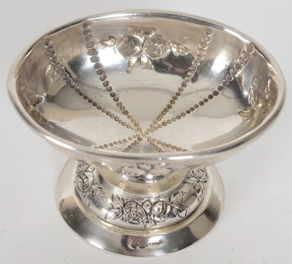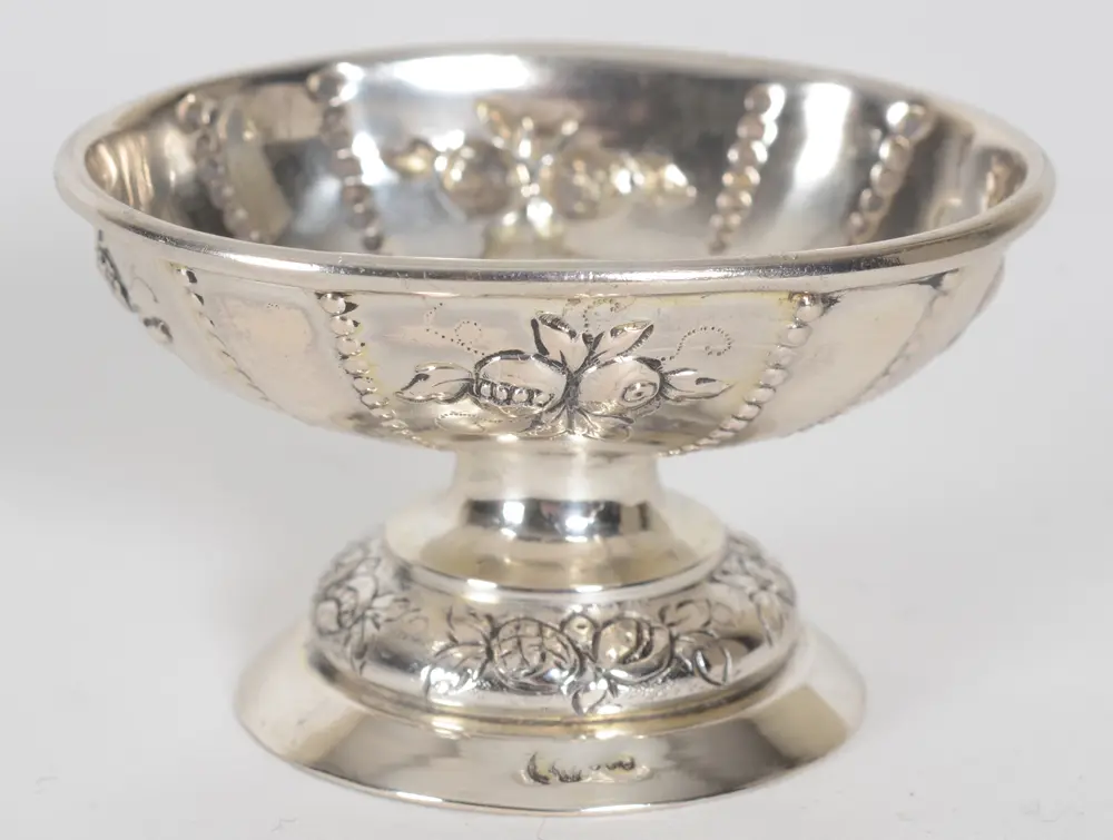 A historismus silver oval egg cup, in the 18th century style, made in Germany around 1900, possibly a Hanau maker, marked on the standing rim with official German marks and alloy mark 800/1000, no makers mark, 4 x 6,5 x 5 cm.