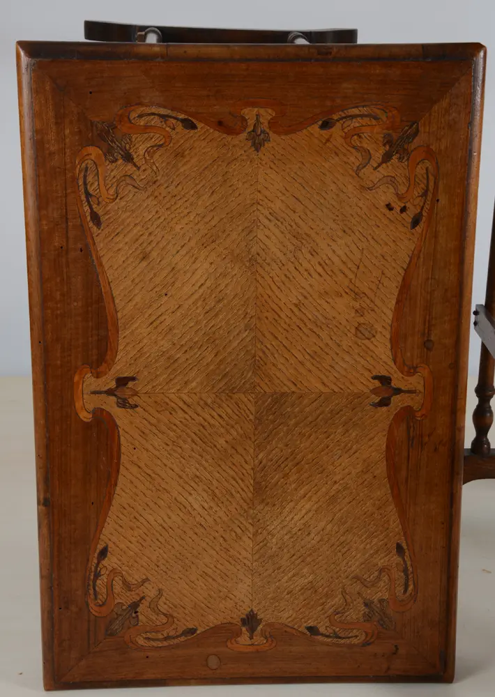 A nest of side tables with marqueterie in art nouveau style, France, ca. 1900, various woods, some stains and traces of use, but overall in reasonable original condition. Largest table: height 73 cm, dimensions top 56 x 37 cm; Middle side table: height 69,5 cm, dimensions top 47 x 36 cm; Smallest side table: height 68 cm, dimensions top 41,5 x 36 cm;