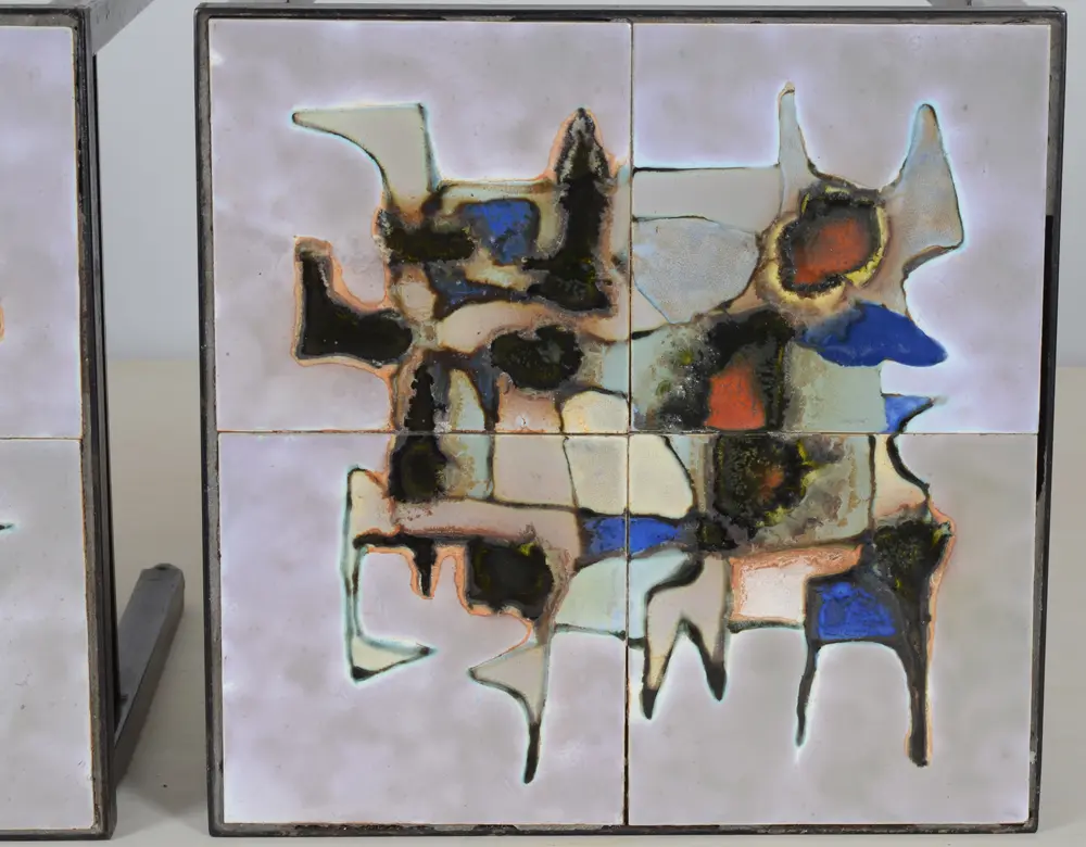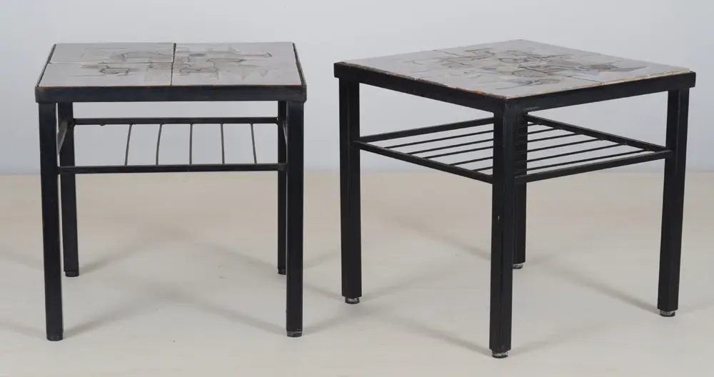 Achiel Pauwels (born 1932), attributed to, a pair of occasional tile tables on a painted metal base, probaby 1960's, unsigned, dimensions 32 x 32 x 32 cm each (tiles 15,5 x 15,5 cm). The tiles in good condition, but perhaps some in need of refixation. One of the tables is missing a horizontal metal rod.