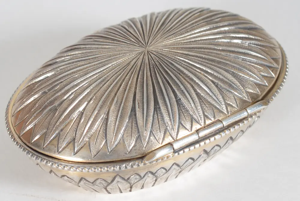 A finely chissled oval silver and silver gilt box in the L XVIth style, probably made in France around 1900-1920, makers mark difficult to decipher (? lion passant 'G'?), possibly Paris, in good condition, the gilding on the outside worn off, the inside in very good condition. No dents. Dimensions 3 x 7,5 x 5,5 cm, weight 54 grams. Alloy 950/1000.