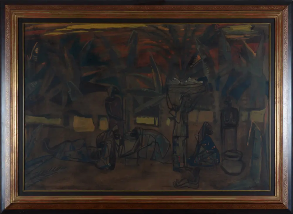 Floris Jespers (1889 - 1965), A Congolese market by dusk, ca. 1952-1959, oil on paper laid down on board, signed bottom right 'Jespers', 70 x 103 cm, dimensions with modern frame 90 x 123,5 cm. Unexamined out of frame. Provenance: Galerie De Vuyst; private collection