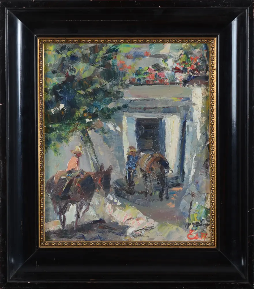 Georges Steel (1923-2010) 'don Jorge', 'A typical scene at Capileira' (Spain), 1977, signed with the monogram and dated bottom right, oil on canvas laid down on board, 27 x 23 cm. Dimensions with the frame 37 x 32,5 cm. A colourful study, at the back with title in pencil and exhibition number '9'.