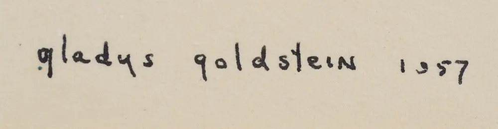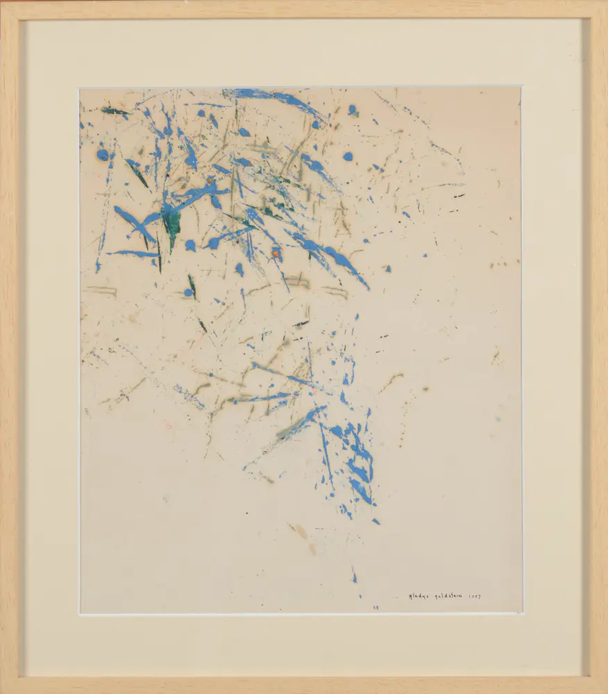 Gladys Goldstein (1918-2010), an abstract composition on paper, oil (?) on paper, signed and dated in ink bottom right, 29,5 x 25 cm (day measure), dimensions with modern frame 39,5 x 35 cm. Unexamined out of frame.