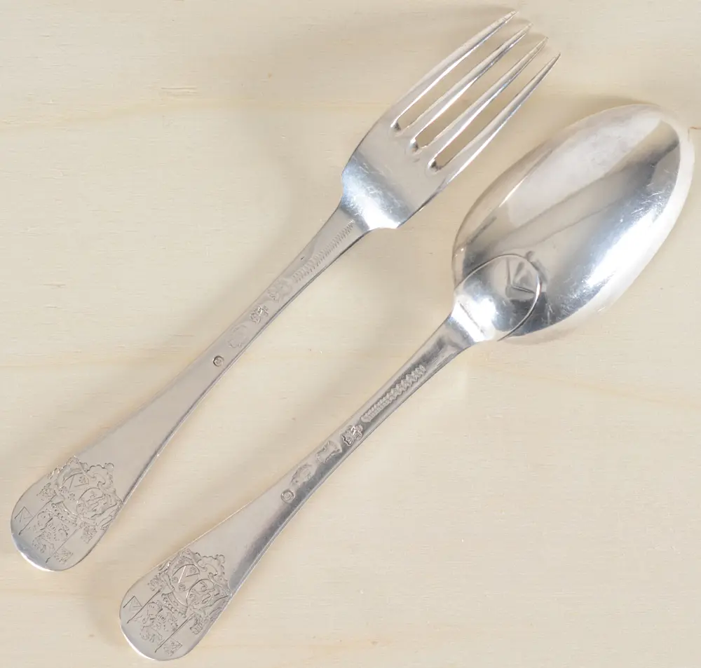 Jacques-François Wery, a silver fork and spoon with the rest of the de Donnea de Hamoir et Wampe Family, Liège, date letter 'C' for 1766-67, good clear marks, weight 119 grams, length spoon 20 cm, lenght fork 19,5 cm. Provenance: private collection.