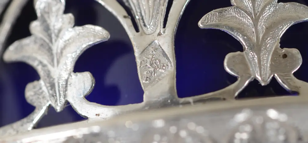 Jean-Pierre-Nicolas Bibron (Paris), a pair of silver and blue glass empire or regency salts, Paris, 1809, consistently marked, alloy mark for 950/1000, dimensions 21 x 18,5 x 7,5 cm, in good condition with traces of use, the blue glass possibly later.