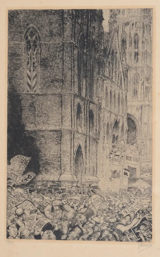 Jules De Bruycker (1870-1945), Kerwinkel onder de draake, 1932 (crowd beneath the belfry tower in Gent) (le Roy 185), final state of the etching, 26,6 x 17 cm (plate), justified '72/122' in pencil bottom left, with signature bottom right. From the 'Sites et Vision' series, unexamined out of frame, dimensions with the original Leclercq frame 43 x 31,5 cm. Slightly browned and some foxing. Framed between 2 panes of glass.