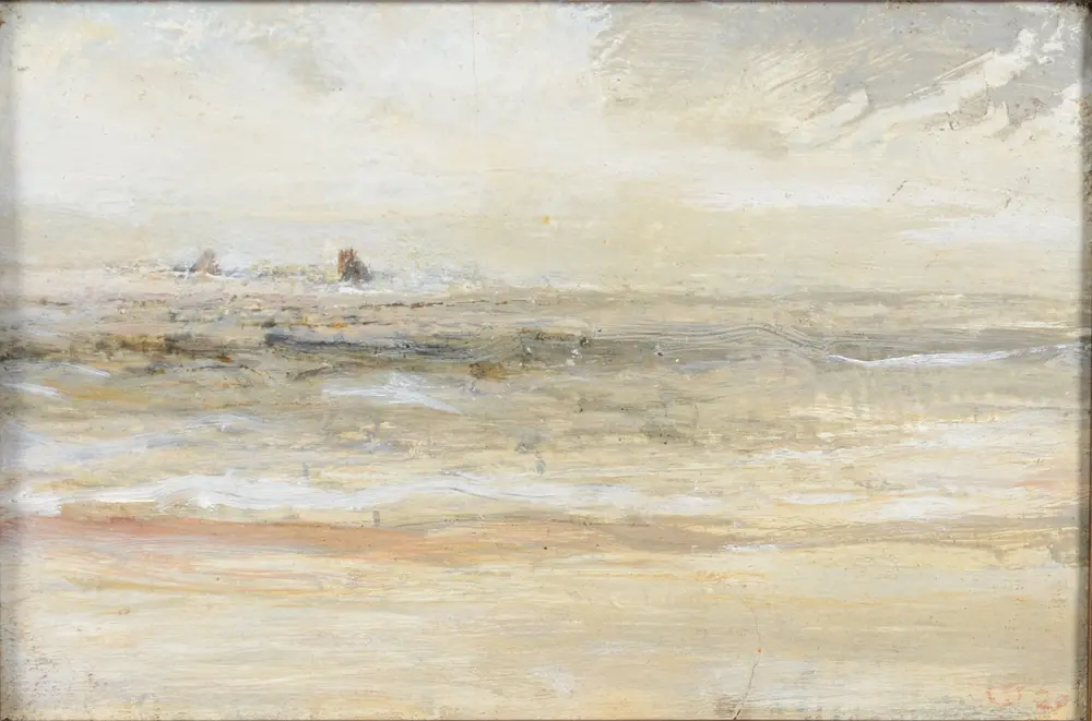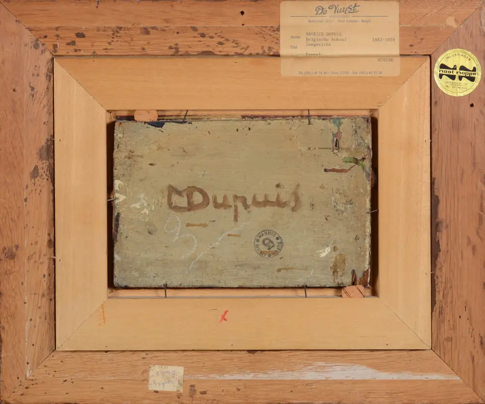 Maurice Dupuis (1882-1959) a view of the North Sea, 1920, oil on panel, signed with the monogram and dated bottom right, and signed again in full at the back of the panel and with the studio stamp at the back, 14 x 21 cm, dimensions with oak frame 33,5 x 40,5 cm. At the back an old label of Galerie De Vuyst.