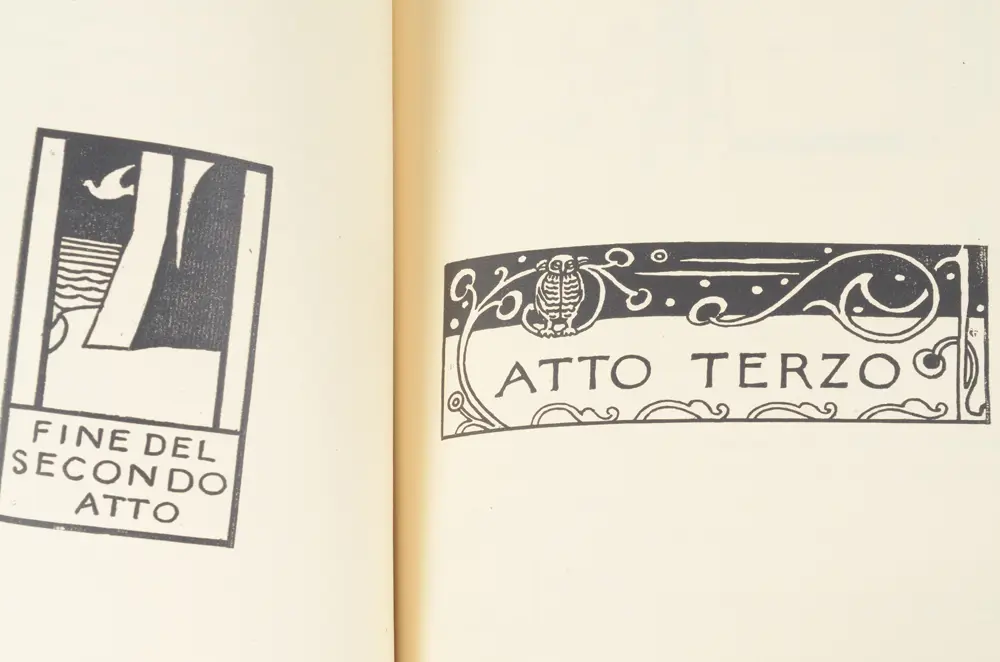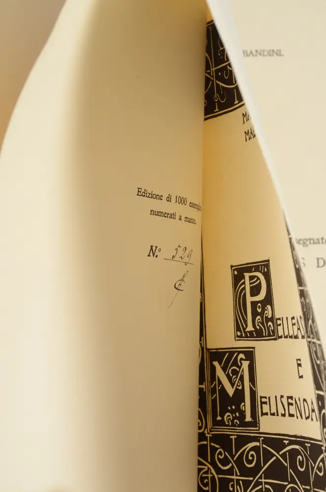 Maurice Maeterlinck (1862-1949) and Charles Doudelet (1861-1938), Pelleas e Melisenda, the Italian version, traduction by Carlo Bandini, edited by Claudio Argentieri Edizione d'Arte (Spoleto - Italy) in 1922, this a numbered and original copy (529/1000), in almost perfect condition (some rubbings to the edges of the covers), some pages uncut. 32,5 x 24 cm, 165 numbered pages, the original soft cover with the "Style Liberty" styled design by Doudelet.