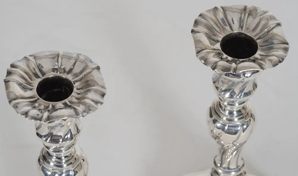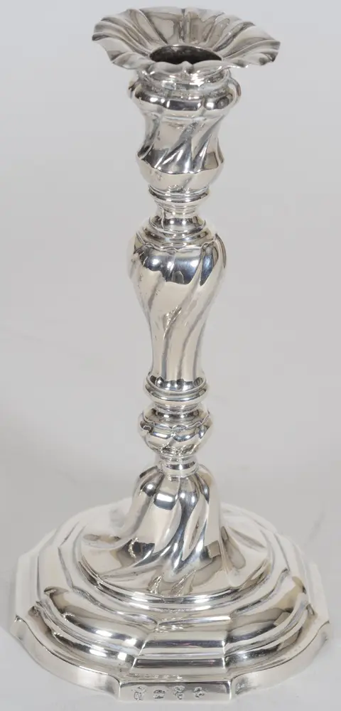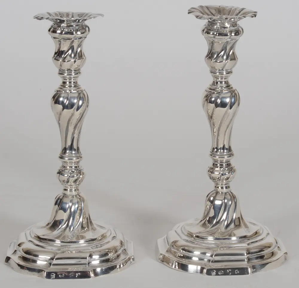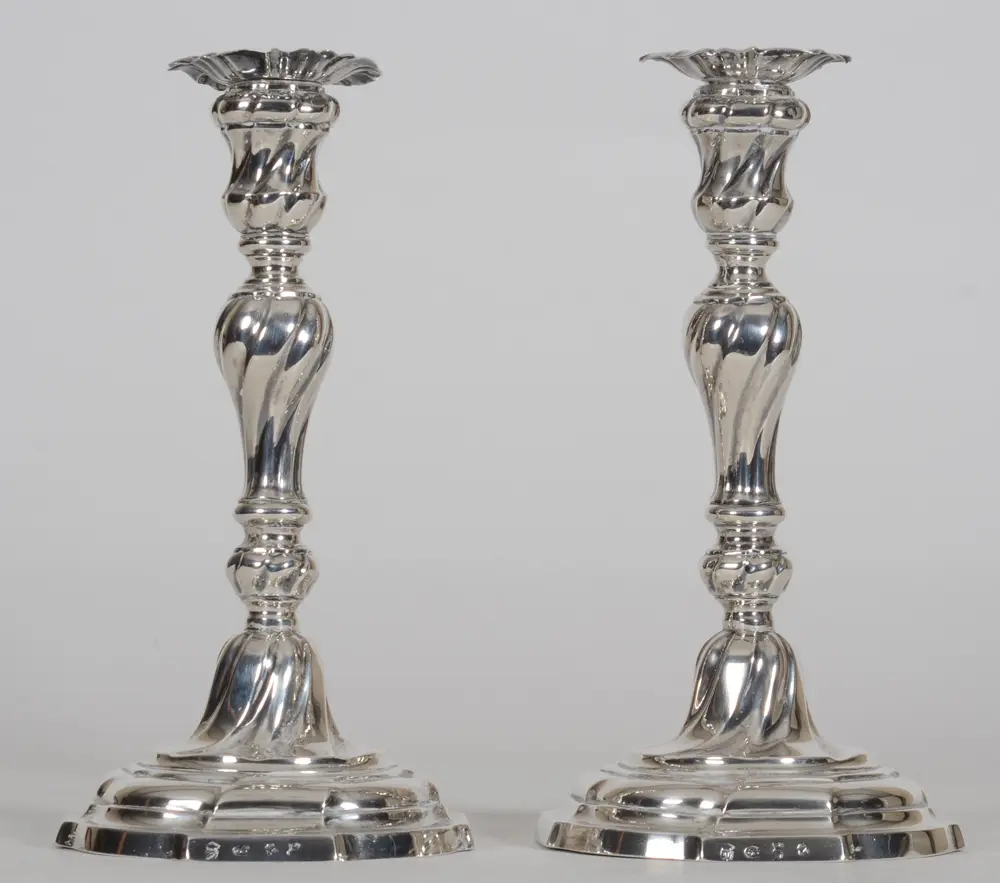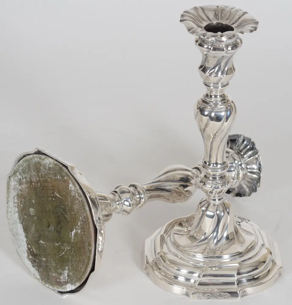 Michiel De Grave or De Graeve (Ghent, master silversmith, active between 1738 and 1779), a good pair of 18th century silver L XV 'torsadé' candlesticks, fully marked on the base, with possible later detachable nozzles, some old restorations, but overall in good usable condition, height +- 25 cm, diameter base 13 cm. A possibility to put history on your dining table!