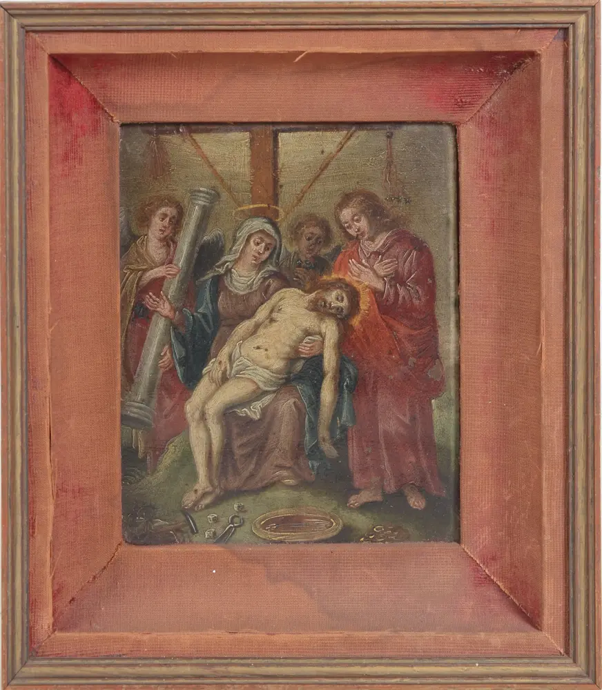 Old Master Painting, deposition from the cross with the Arma Christi, oil on metal