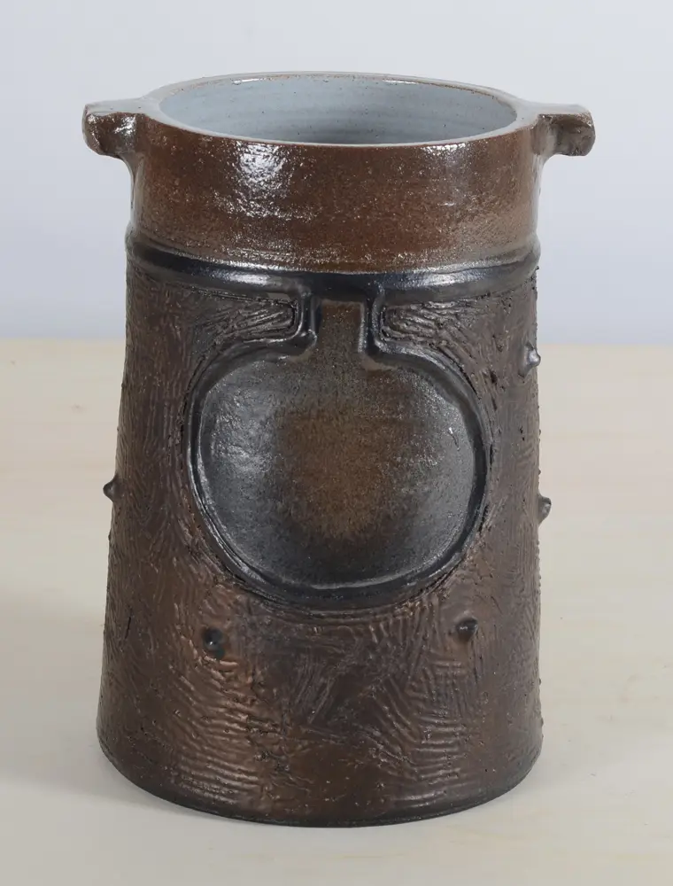 Perignem (Beernem, Belgium), a large reduction glazed vase, probably 1960's, with engraved signature on the bottom of base, height 31,5 cm, diameter 23 cm, width 18,5 cm (handle to handle), in good condition, three minor chips to the inside of the top rim, one bearly visible chip to the base (see photographs). A good representative piece reminiscent of the work by Nyssen or Landuyt at Perignemen.