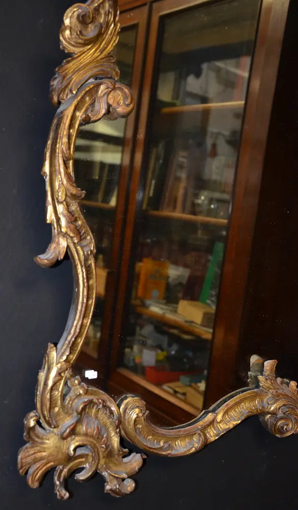 An elegantly curved and finely carved mirror in gilded wood, with a blossoming branch and rocailles surrounding the mirror glass, the frame possibly Dutch, possibly 18th century, the mirror glass later, old restorations to the frame, 132 x 82 cm.