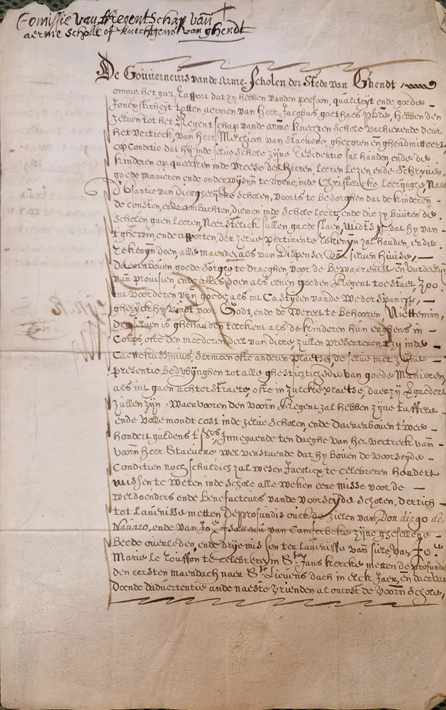 Scheerlijnck B., (comissie van tegentschap van arme schole of kneghtgens van ghendt), een handschrift over de "Arme scholen der Stede van Ghendt", gedateerd 1661 (a handwritten text on schools and teaching in Ghent, dated 1661), ink on paper, one page recto/verso, 30,5 x 20 cm.