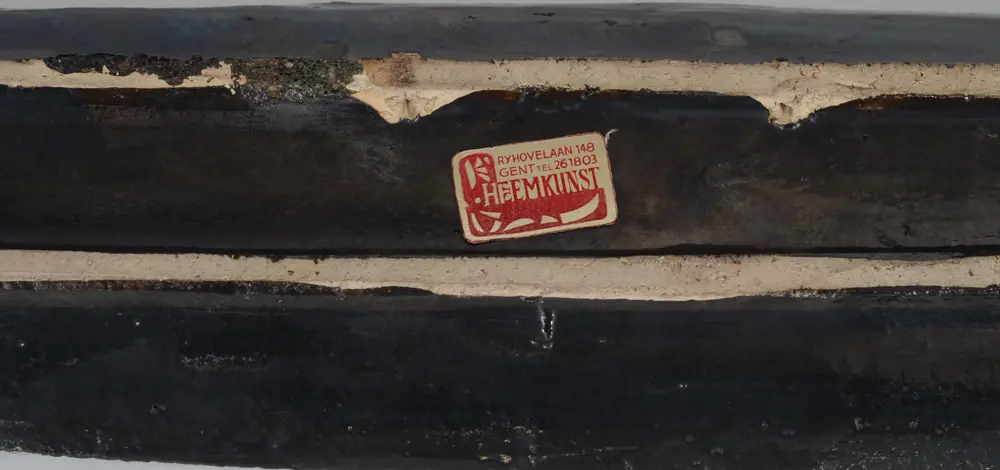 Achiel Pauwels (born 1932), a canoe shaped figurative dish in glazed ceramic, probably 1960's, dimensions 56 x 9,5 cm, as usual unsigned, but with a retailers label at the back. In good condition.