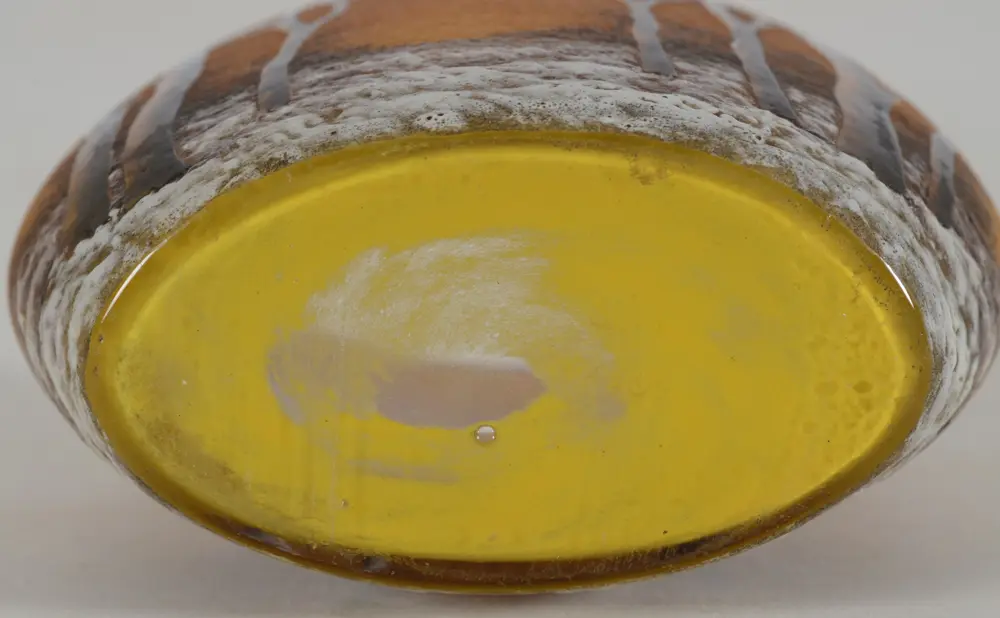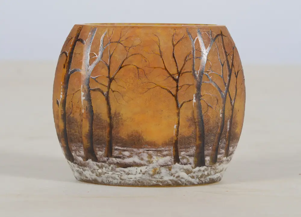 Daum Nancy, a beautifully enameled, acid etched cameo vase depicting a winter landscape, delicately painted with enamel on acid etched glass ground, period art nouveau, signed on the bottom, in good condition, height 8 cm, width 9,5 cm, depth 5,4 cm.