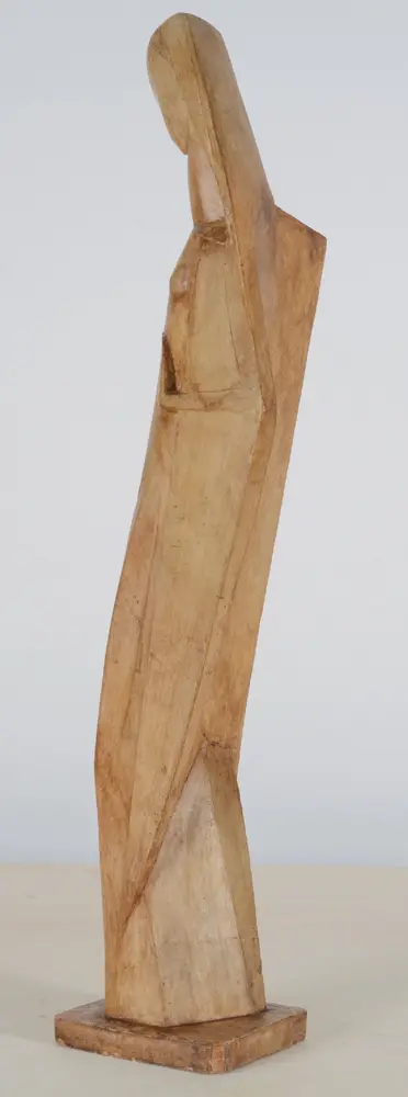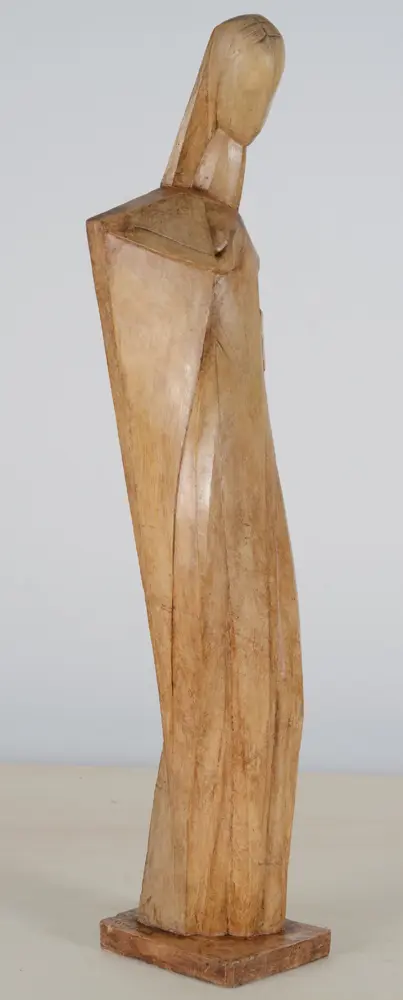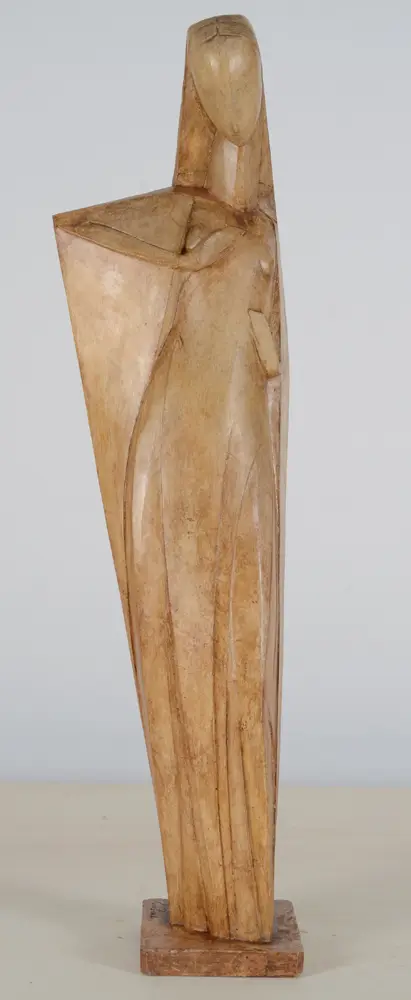 Emile Poetou (1885-1975), Madonna III, ca. 1929, a rare original and early plaster cast with shellac patination, height 89 cm, width 24 cm, base 17,5 x 15,5 cm. Signed on the base 'Em Poetou'. As usual with some restorations.