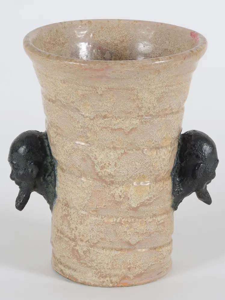 Ernest Patris (1909-1981), Vase aux Chinois (Vase with Chinese heads), probably made in the 1960's, retailed through Dangotte (Ghent), glazed ceramic (moulded and turned), height 28,5 cm, diameter top 21 cm, diameter base 15 cm. Signed into the bottom of the base and with a roman numeral 'V'. In good condition.