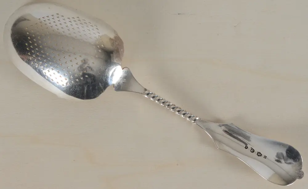 Jan Boon (silversmith working in Schoonhoven), a silver serving spoon, probably for fruit, fully marked on the back of handle with date letter for 1905, and alloy mark for 833/1000, lenght 24 cm, width pierced ladle 6,5 cm, weight 84 grams.