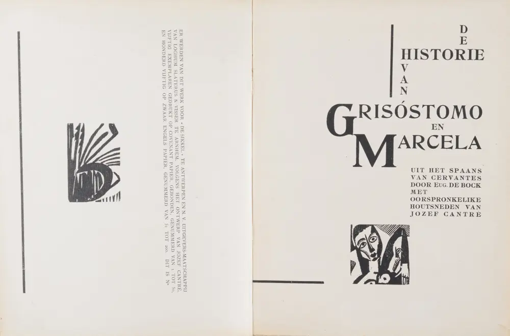 Jozef Cantré (1890-1957) and Eug. De Bock, De Historie van Grisostomo en Marcela uit het Spaans van Cervantes (The story of Grisostomo and Marcela), an illustrated book designed and illustrated by Jozef Cantré, 1922, this a hard cover copy (1 of 50) on 'convenant paper', this copy unnumbered, possibly an editors or sample copy, in very good condition on the inside, with some pages uncut, 33 x 24,5 cm, the covers slightly soiled. A rare book, with ex-libris of Jean Jacobs.